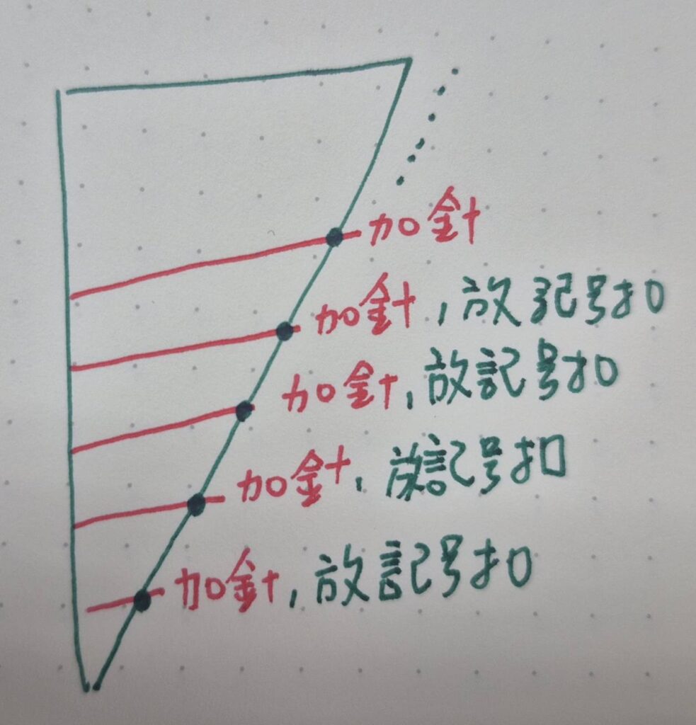 我的救命稻草:記號扣狂放術 經歷無數次來來回回的拆除現場後,我悟出了一個道理:記號扣不能省! 在直角三角形階段,每一段「加針的第一針」一定要標起來。記號扣真的是放好放滿XD。